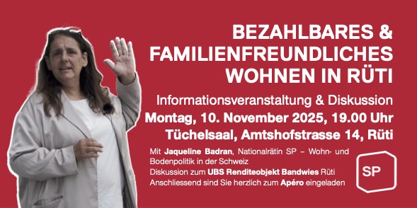 Am Montag 10.11.2025 fand im Tüchelsaal in Rüti ein gut besuchter Informationsanlass zum Thema “Bezahlbares Wohnen” statt. NR Jacqueline Badran orientierte zunächst allgemein zum Thema Wohnungspolitik und leitete dann über