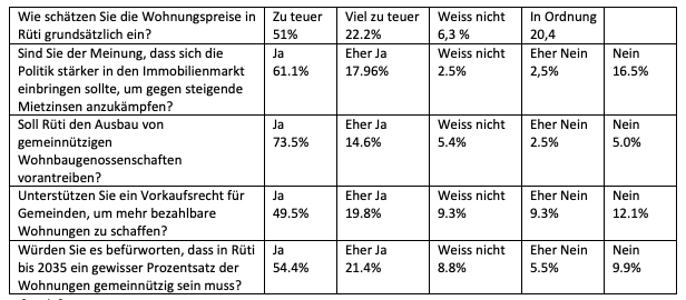 Die SP Rüti fühlt sich in diesen Punkten auch bestärkt durch eine von ihr im Oktober 2024 durchgeführte Umfrage an der 270 Personen aus Rüti teilnahmen. Klare Mehrheiten in dieser Umfrage wünschten Wohnbaugenossenschaften, einen festen Anteil an gemeinnützigen Wohnungen und das Vorkaufsrecht für die Gemeinden. Die Politik soll sich gemäss der überwiegenden Mehrheit der Befragten stärker in den Immobilienmakt einbringen, um gegen steigende Mietzinsen zu kämpfen.